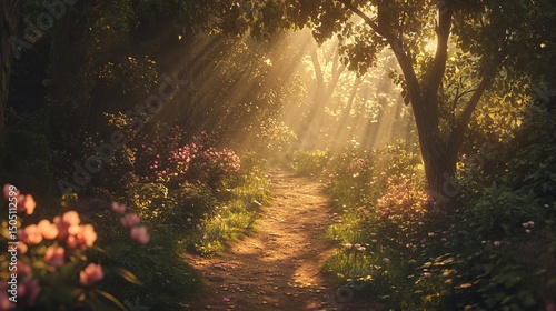 Naklejka premium A sunlit path winding through a lush forest with flowers and trees casting...