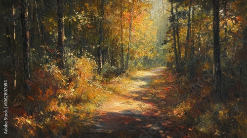 Obraz premium A sunlit path winds through a dense forest, dappled sunlight filtering through the trees.