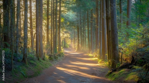 © Wish Craft Arts, Fototapeta premium A sunlit path winds through a dense forest, sunlight filtering through the tall trees.
