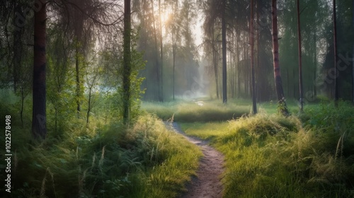 Fototapeta premium A sunlit path winds through a misty forest, dappled light filtering through...