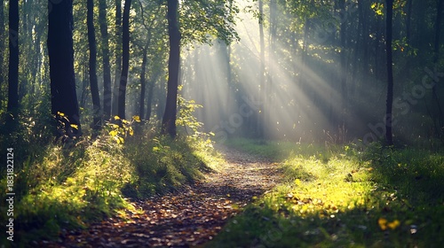 Obraz premium A sunlit path winds through a misty forest, dappled sunlight illuminating the...