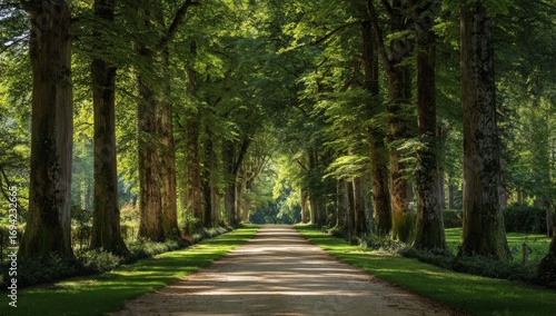 © Rahma, Naklejka premium A sunlit pathway lined with lush trees
