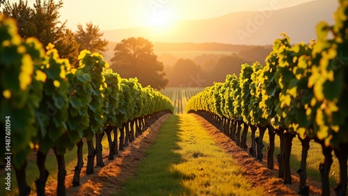 Naklejka premium A sunlit pathway through a vineyard at sunrise