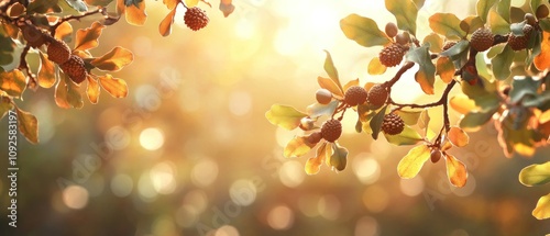 Obraz premium A sunlit scene featuring branches with leaves and berries, creating a warm,...