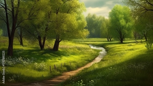 Fototapeta premium A sunlit spring meadow path