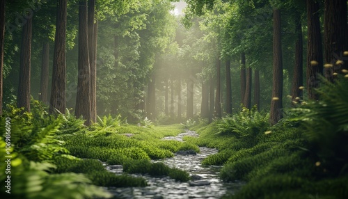 Obraz premium A Sunlit Stream Winding Through a Lush, Misty Forest