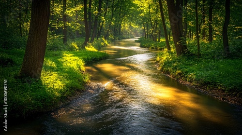 © bcendet, Obraz premium A sunlit stream winds through a lush green forest.