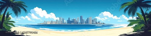 © nur, Obraz premium A sunny beach scene showcases a coastal city skyline view