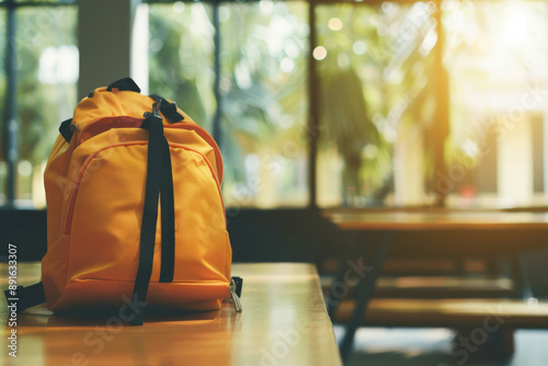 Obraz premium A sunny classroom with a bright yellow backpack on a desk, symbolizing the anticipation and optimism that comes with a new school day and learning adventure.
