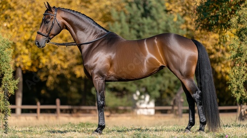 © Julia, Obraz premium A sunny day outdoors provides the perfect backdrop for a close-up of a chestnut horse featuring a flowing mane in a grassy field