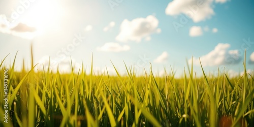 Fototapeta premium A sunny day's vibrant green grass field, a close-up view of nature's beauty under a bright sky with fluffy white clouds.