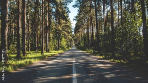 Naklejka premium A sunny day with a long deserted road flanked by tall trees