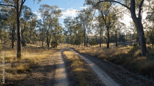 © Rere_Art151, Obraz premium A sunny dirt road winds through a lush forest environment