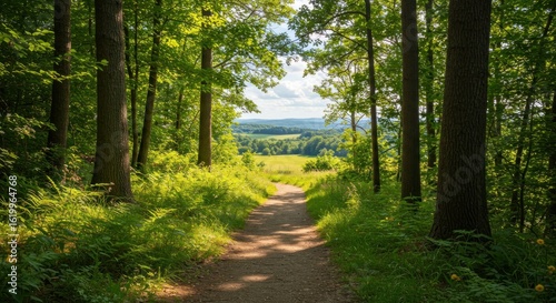 Obraz premium A sunny forest path winds toward a distant open field. Trees line the trail,...
