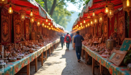 © Mr.Pancho Store, Obraz premium A Sunny Sidewalk Scene: Tables, Items, People, and Trees on a Busy Day