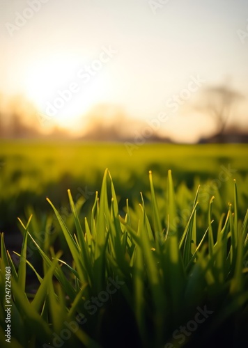 © Pixel Sage, Fototapeta premium A sunny spring easter morning sunrise background with a fresh green grass foreground bokeh green bokeh green abstract background light bright blur pattern