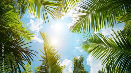 © masyastadnikova, Naklejka premium A sunny tropical background with palm trees and a blue sky. A view from below