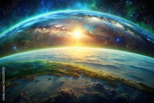 Fototapeta premium A Sunrise Over a Lush, Alien World with Vibrant Nebulae and Starry Sky