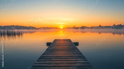 © Pug, Naklejka premium A sunrise over a tranquil lake with a wooden pier evokes peace and serenity.