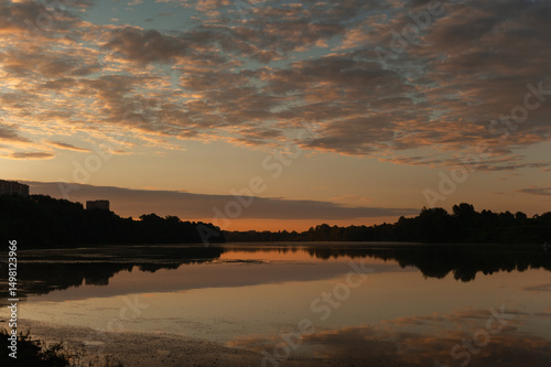 Obraz premium A sunrise over a tranquil summer lake, dark photo
