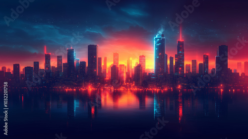 Fototapeta premium A sunset backdrop highlights a neon-filled futuristic city, with high-rise...