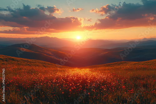 © Sebastian, Fototapeta premium A sunset casting a warm glow over rolling hills and distant mountains. Concept of Earth's daily cycles and natural rhythms.