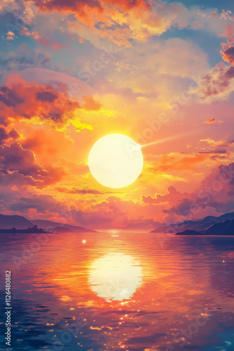 Naklejka premium A sunset over a body of water with a full moon in the sky