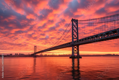 © Florian Dussart, Fototapeta premium A sunset over a bridge and the city