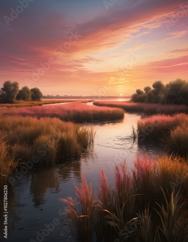Fototapeta premium A sunset over a marsh with reeds and water and trees