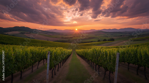 Fototapeta premium A sunset over a vineyard in Tuscany with rows of grapevines stretching out under a sky filled with warm golds and deep purples and the hills bathed in light.