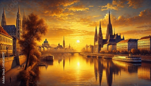 © MENG XIAO, Obraz premium A sunset over Danube River in Vienna, water reflecting Stephenson spire and skyline.jpeg