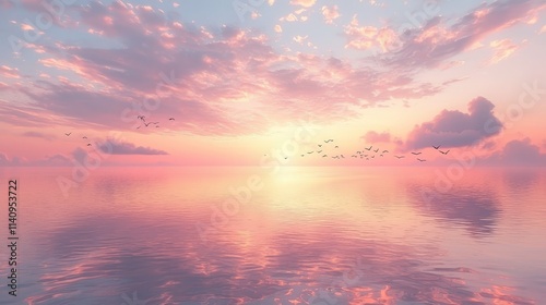 © Albert, Obraz premium A sunset over the ocean with birds flying in the sky
