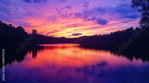 Fototapeta premium A sunset reflecting off a lake, with colors transitioning from orange to purple.