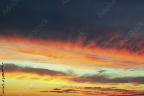 © Lidia, Obraz premium A sunset sky with vibrant hues of orange, pink and purple. The clouds create a dramatic and colorful display. Concept of tranquility of nature. Gradient of colors from deep purple to vibrant orange