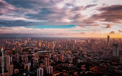© Towering Goals, Fototapeta premium A sunset view of the South Mumbai cityscape shot from Byculla. The view spans from Fort and Nariman Point in the west to Walkeshwar and Mumbai Central in the east.