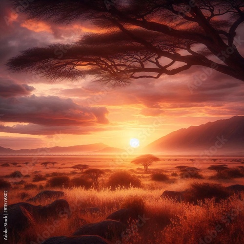 © Shohag, Obraz premium A sunset with a tree and mountains in the background.