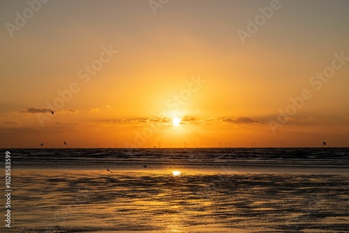© Wirestock, Obraz premium a sunset with the sun setting behind a cloud filled sky
