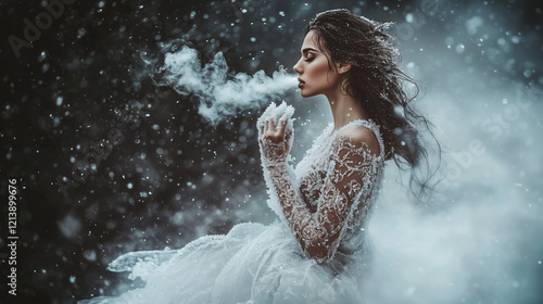 Obraz premium A supermodel with frosty makeup, dressed in an ethereal ice gown, breathes mist in a dreamlike winter setting