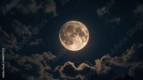 © phattharabodin, Fototapeta premium A supermoon rising, appearing larger than usual in the night sky, with clouds drifting across it.