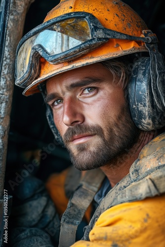 © Aleksander, Fototapeta premium A surface mine equipment fitter rugged male miner wearing an orange helmet and protective gear, with a serious expression. His face is dirty from work, and he has a beard.