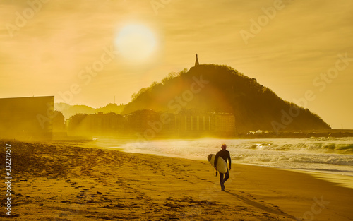 Obraz premium A surfer walking on the Zurriola Beach at sunset with the Monte Urgull in the...