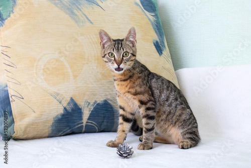 © Vera Aksionava, Fototapeta premium A surprised kitten sits on a bed