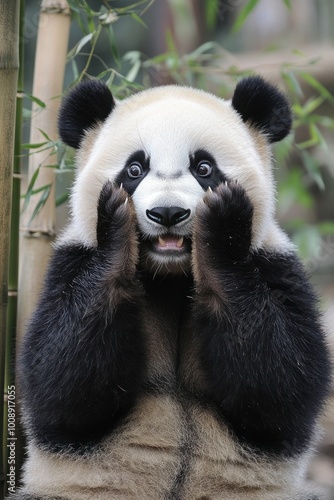 Obraz premium A surprised panda with its paws on its face, surrounded by bamboo.