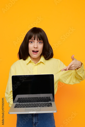 © SHOTPRIME STUDIO, Naklejka premium A surprised woman stands against a vivid yellow background, presenting a laptop with both hands, creating a playful and energetic moment of online exploration.
