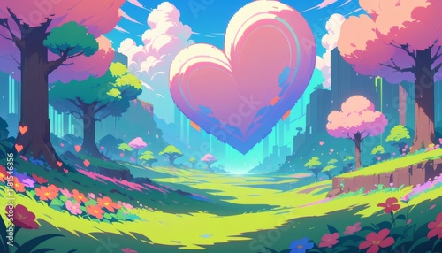Fototapeta premium a surreal and idyllic fantasy anime videogame style landscape with trees grass and hearts to symbolize love and valentine in a natural environment