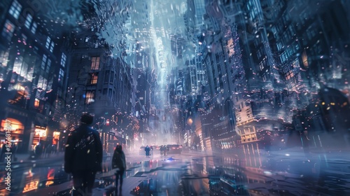 Obraz premium A surreal cityscape where buildings appear to melt into each other and the streets seem to shift and change before your eyes