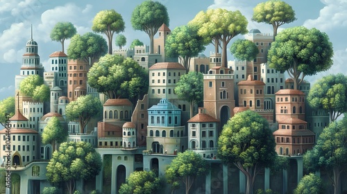 Naklejka premium A Surreal Cityscape with Buildings Intertwined with Trees