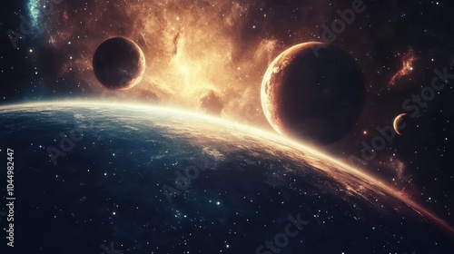 © Ilya, Obraz premium A surreal cosmic scene where planets and stars align in harmonious patterns, inviting contemplation of the universe.