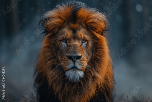 Fototapeta premium A surreal image capturing a lion with a stunning mane under snowfall,...