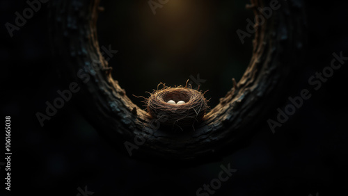 Fototapeta premium A surreal image of a nest within an empty, dark space.